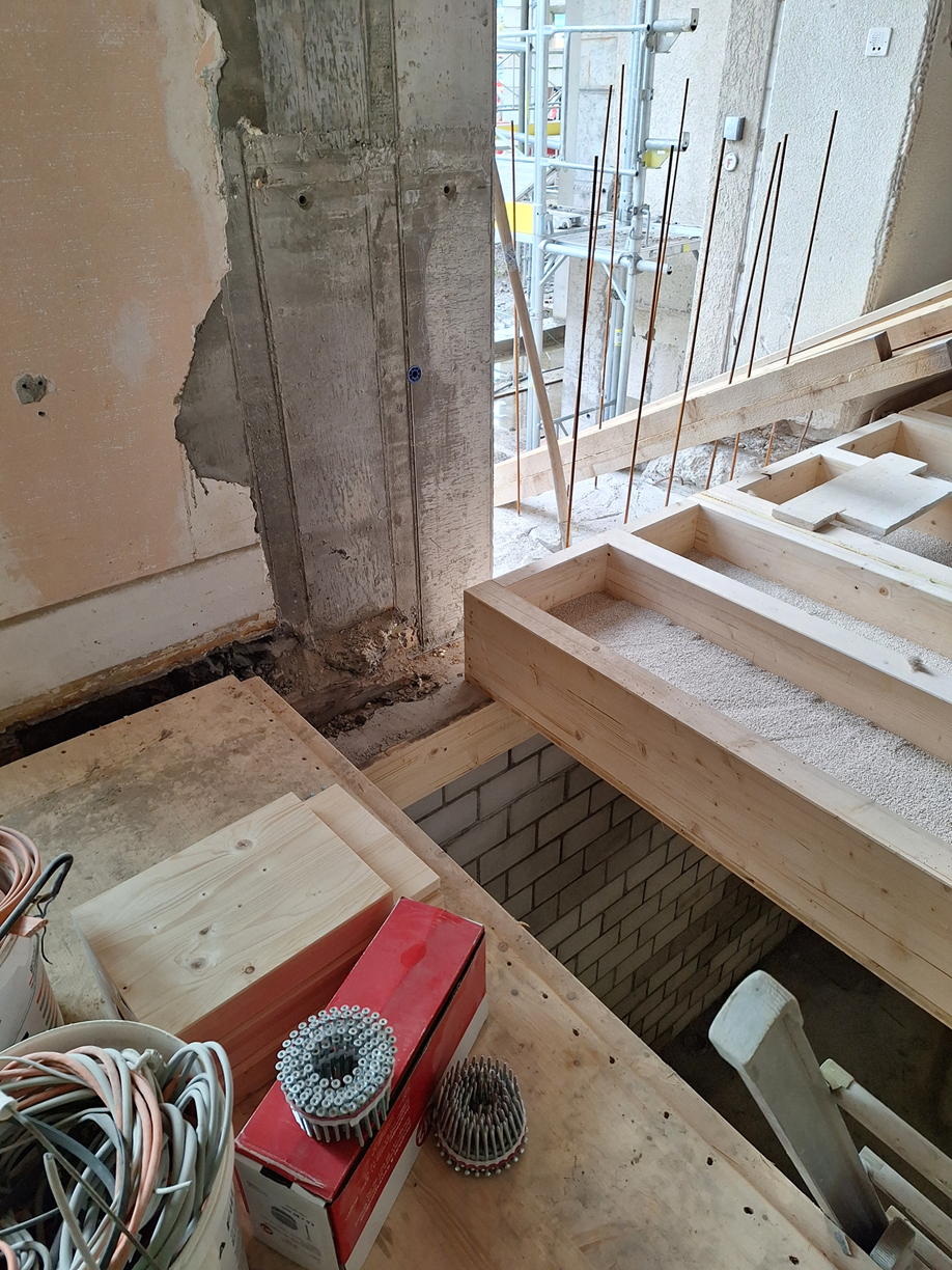 Holz ist ideal für solche Umbauten im Bestand. Es ermöglicht Entkopplung, bleibt im Trockenbau, bringt also keine zusätzliche Feuchtigkeit ins Gebäude und ist sehr flexibel anpassbar. Zudem ist es gut transportierbar und eignet sich hervorragend für die unterschiedlichen Situationen, die man im Bestand antrifft.