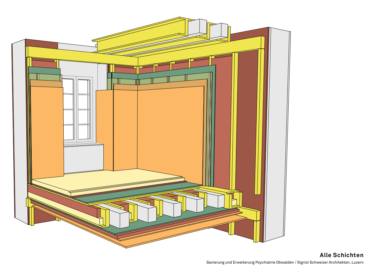 «Beim Bauen im Bestand startet man oft mit nur 50% Prozent Wissen, also relevanten Informationen – der Rest zeigt sich erst während der Umsetzung.» Michael Enz, Projektleiter beim Umbau der Psychiatrie Sarnen erklärt, wie mit entkoppelten Holzdecken und Raum-im-Raum-Konstruktionen ein denkmalgeschütztes Gebäude zukunftsfähig gemacht wurde.